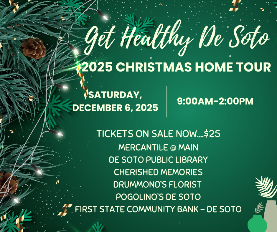 The 2025 Get Healthy De Soto Christmas Home Tour will be on Saturday, December 6, from 9:00 am-2:00 pm. Nine beautiful properties will be featured on this year’s tour and we couldn’t be more excited! The theme of this year’s tour is “Winter Wonderland”. Tickets are on sale at the following businesses – Mercantile @ Main, De Soto Public Library, Cherished Memories, Pogolino’s De Soto, Drummond’s Florist, and First State Community Bank. Tickets are $25. Thank you to all of our properties for being on the tour and to the businesses who are selling the tickets.