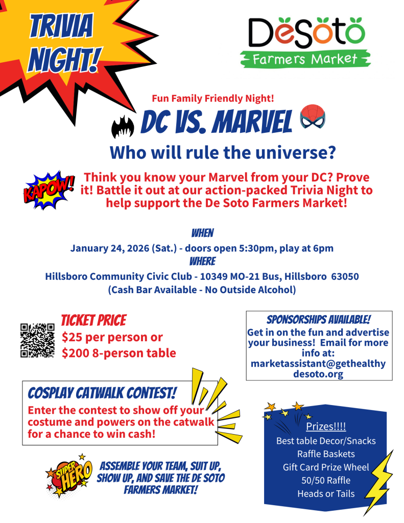 We’ll be having Trivia Night at the Hillsboro Civic Center this year. Our theme is DC vs Marvel Comics and it is a family friendly experience! Tables of 8 are $200.00 or individual tickets are $25.00 per person. Sponsorships are available for this event!